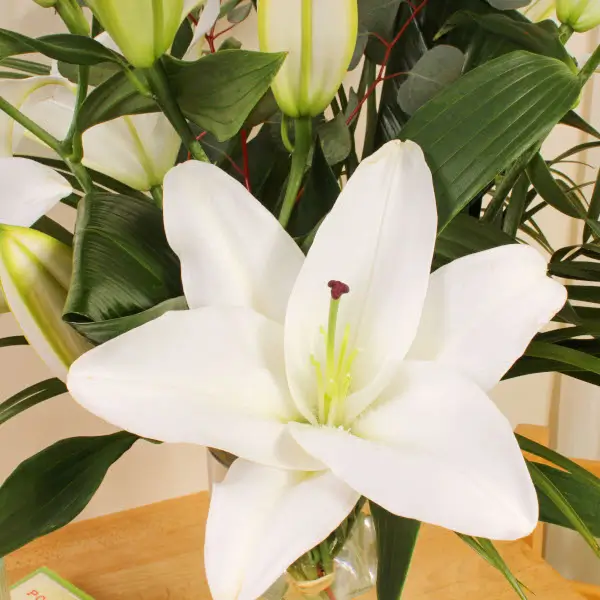 A classic, elegant bouquet of scented white Lilies adds glamour to any interior, makes the perfect gift for anniversaries and birthdays. This bouquet will be handcrafted by an experienced florist, order for same day delivery by hand, or next day delivery via our courier.
